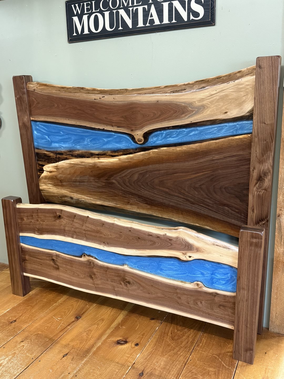 UWW-615-Q - Junior Queen Bed w/Standard Footboard, Caribbean Resin - 64 x 57 High - Solid Rustic Live Edge Walnut - Tamba Bay Collection UWW-615-Q - Junior Queen Bed w/Standard Footboard, Caribbean Resin - 64 x 57 High - Solid Rustic Live Edge Walnut - Tamba Bay Collection