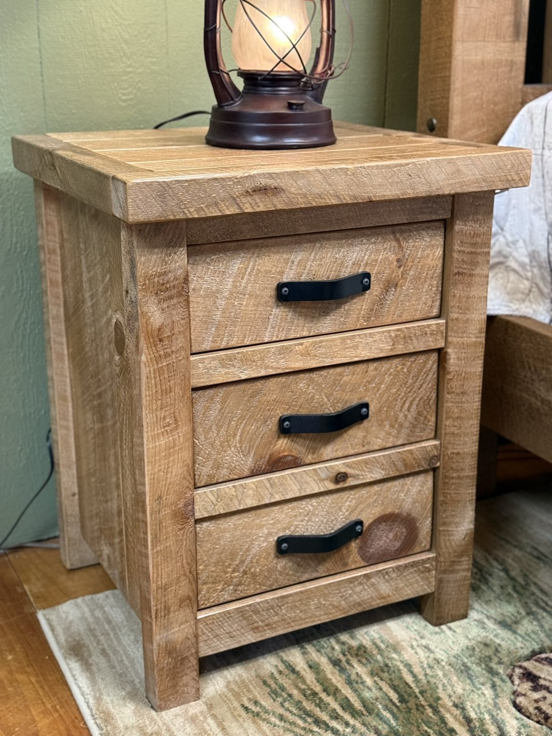 D242093-RU/ - 3 Drawer Nightstand - 22 x 20 x 28 - Solid Circle Sawn Pine - Deluxe Sawmill Collection D242093-RU/ - 3 Drawer Nightstand - 22 x 20 x 28 - Solid Circle Sawn Pine - Deluxe Sawmill Collection
