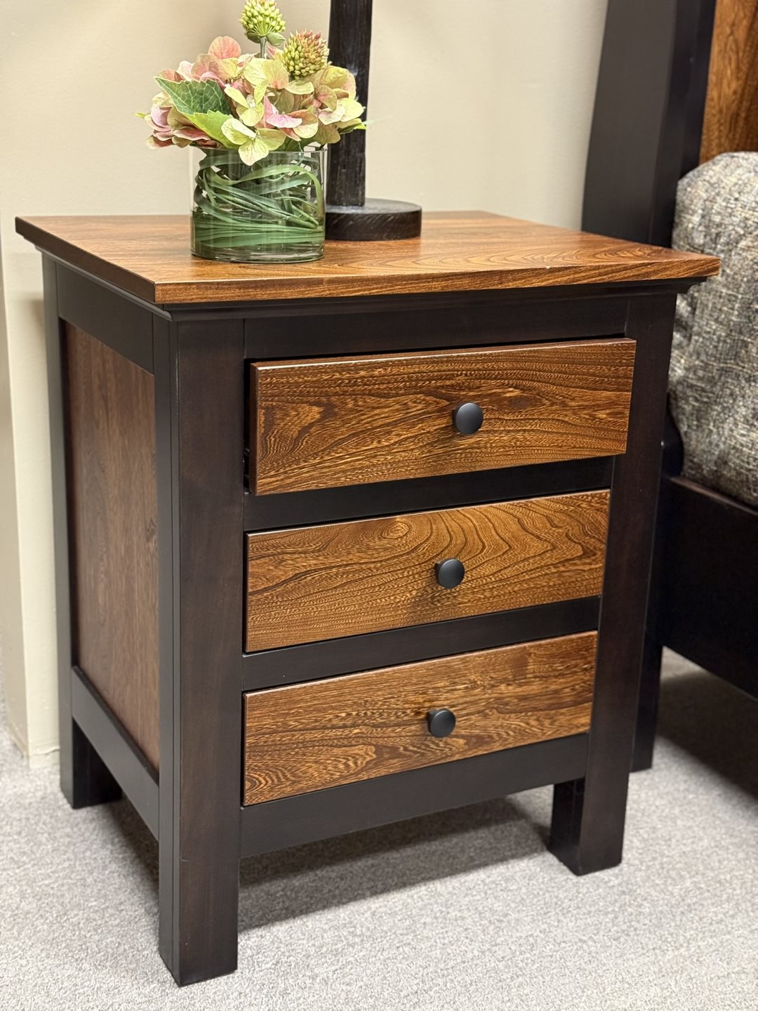 322/ - 3 Drawer Nightstand - 23 x 18.75 x 28 - Solid Brown Maple & Elm, 2 Tone Stain - London Collection 322/ - 3 Drawer Nightstand - 23 x 18.75 x 28 - Solid Brown Maple & Elm, 2 Tone Stain - London Collection