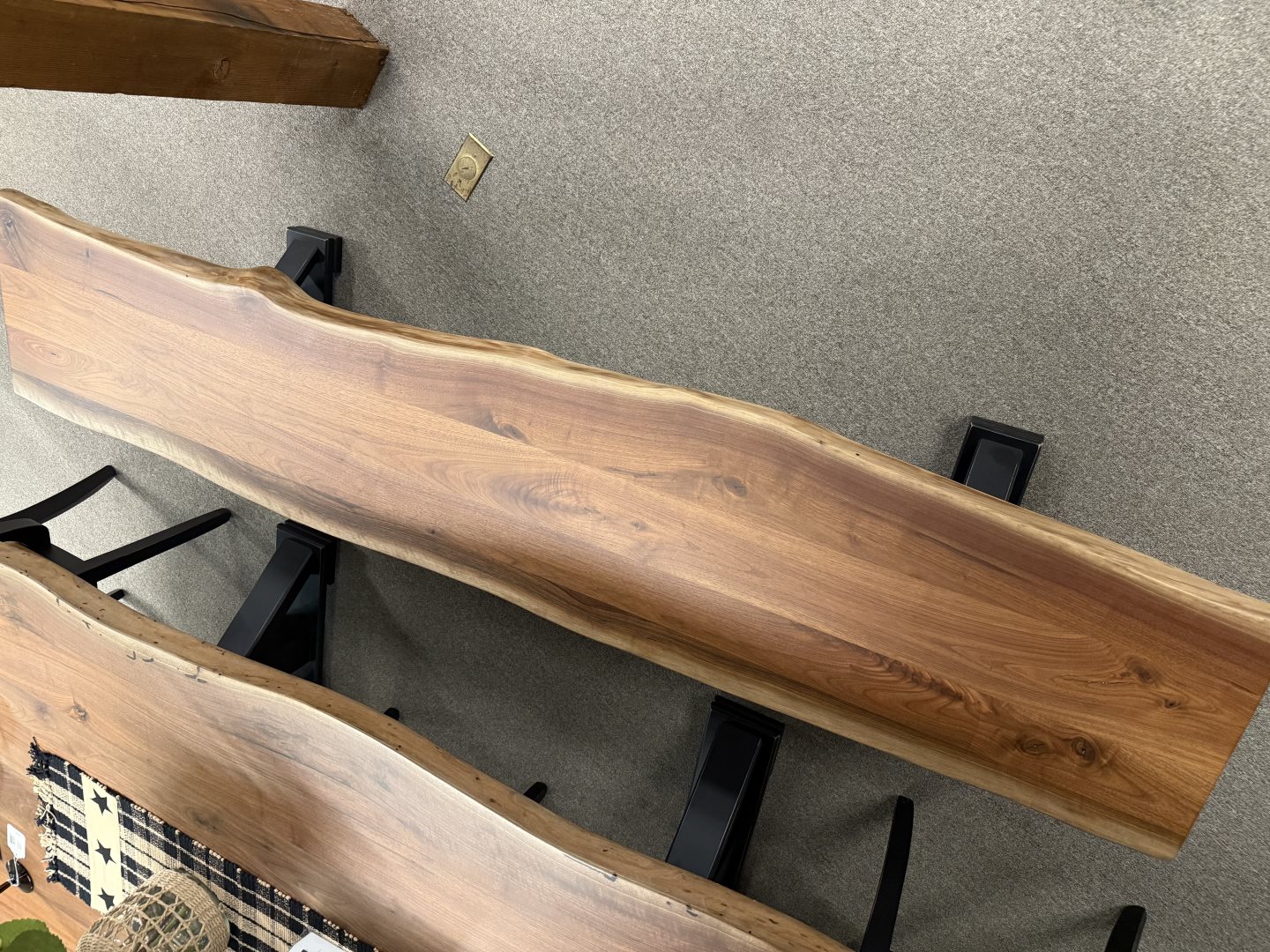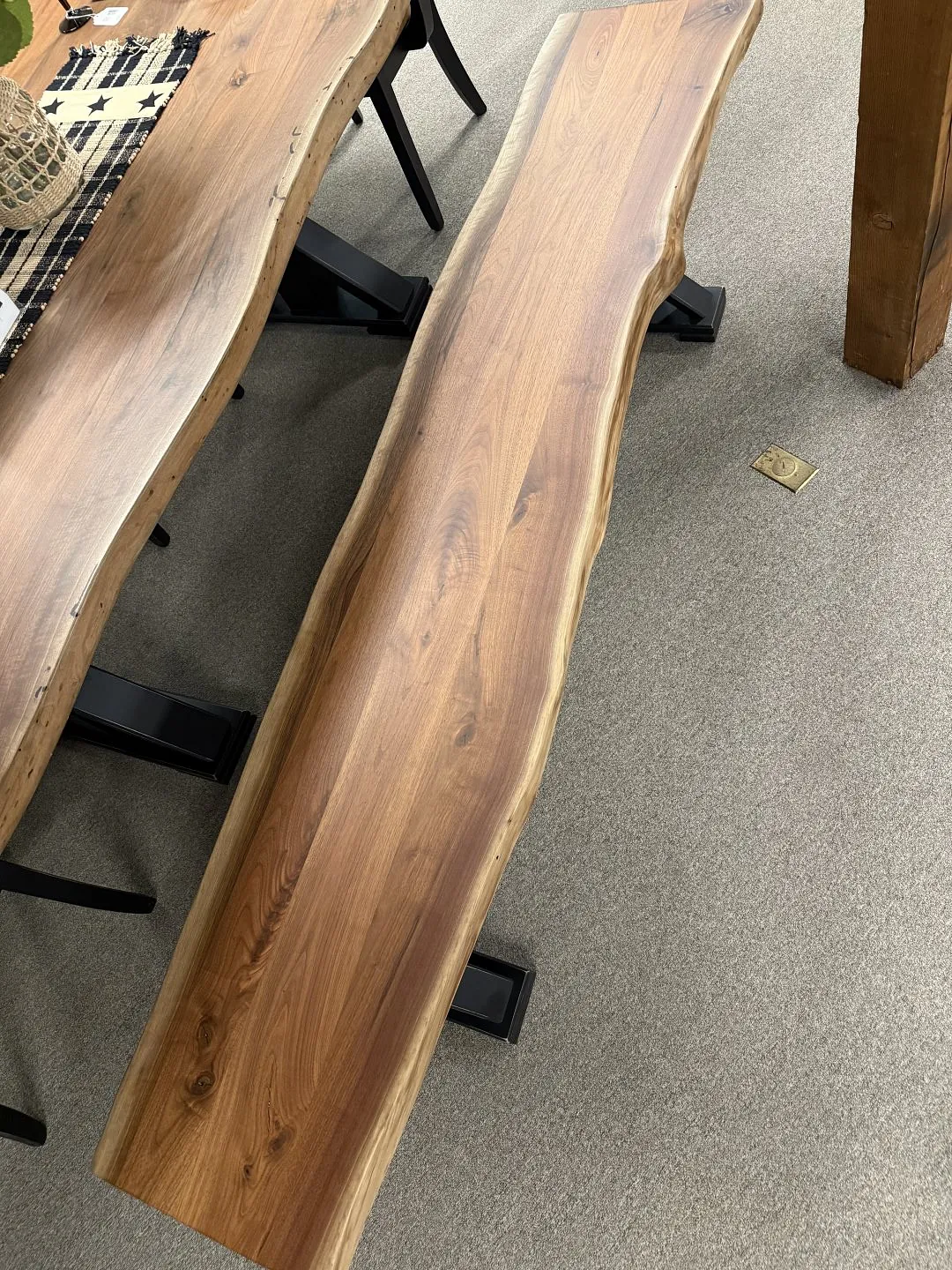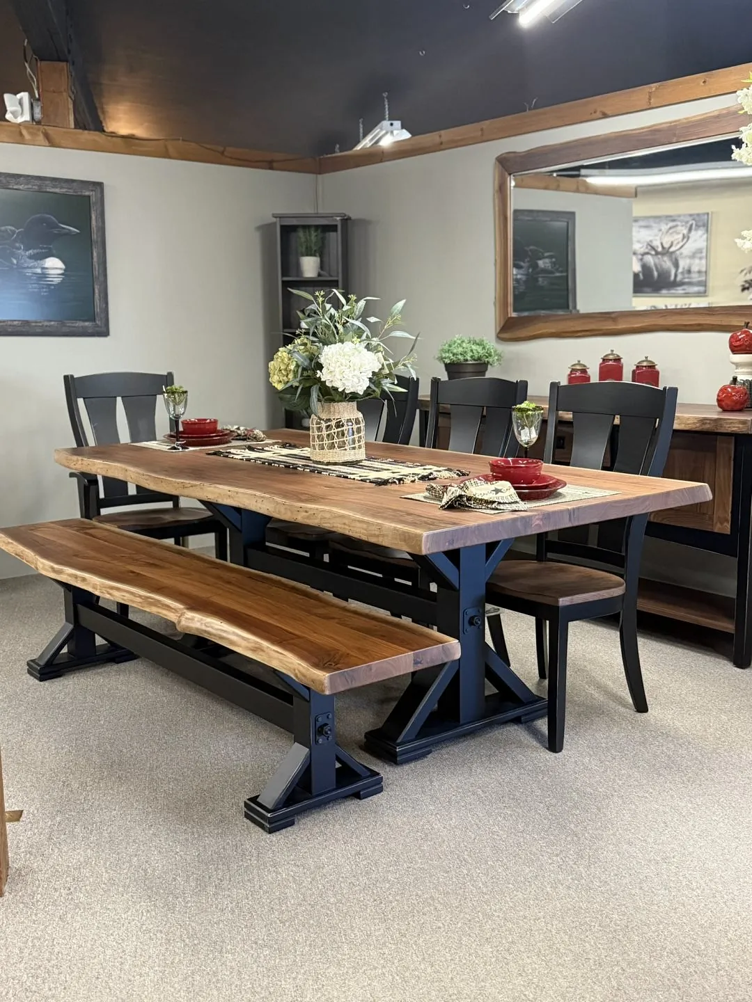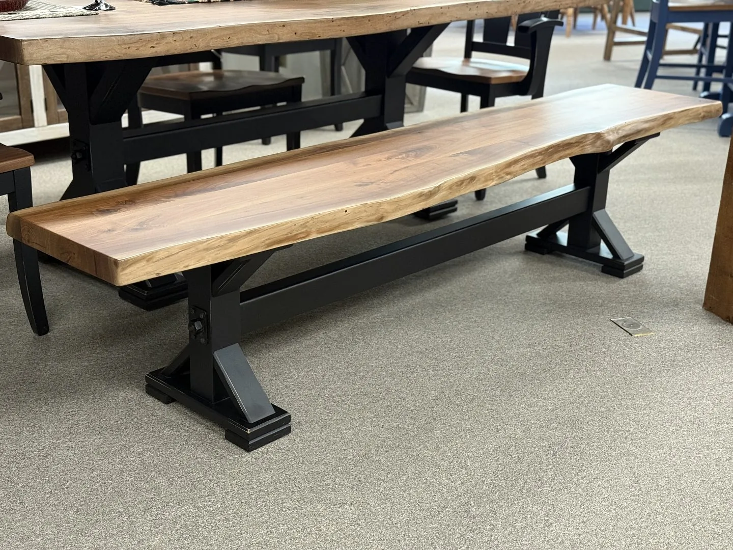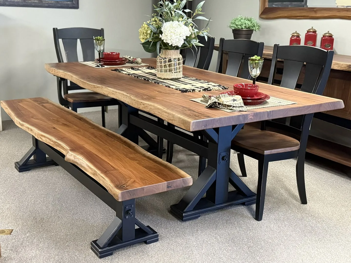 Live Edge Walnut Table (#LIVE/1), Bench, & Omaha (#2500) Chairs - 42 x 84 - 2" Thick Walnut, Brown Maple Base, Painted Black w/Rub Thru Live Edge Walnut Table (#LIVE/1), Bench, & Omaha (#2500) Chairs - 42 x 84 - 2" Thick Walnut, Brown Maple Base, Painted Black w/Rub Thru