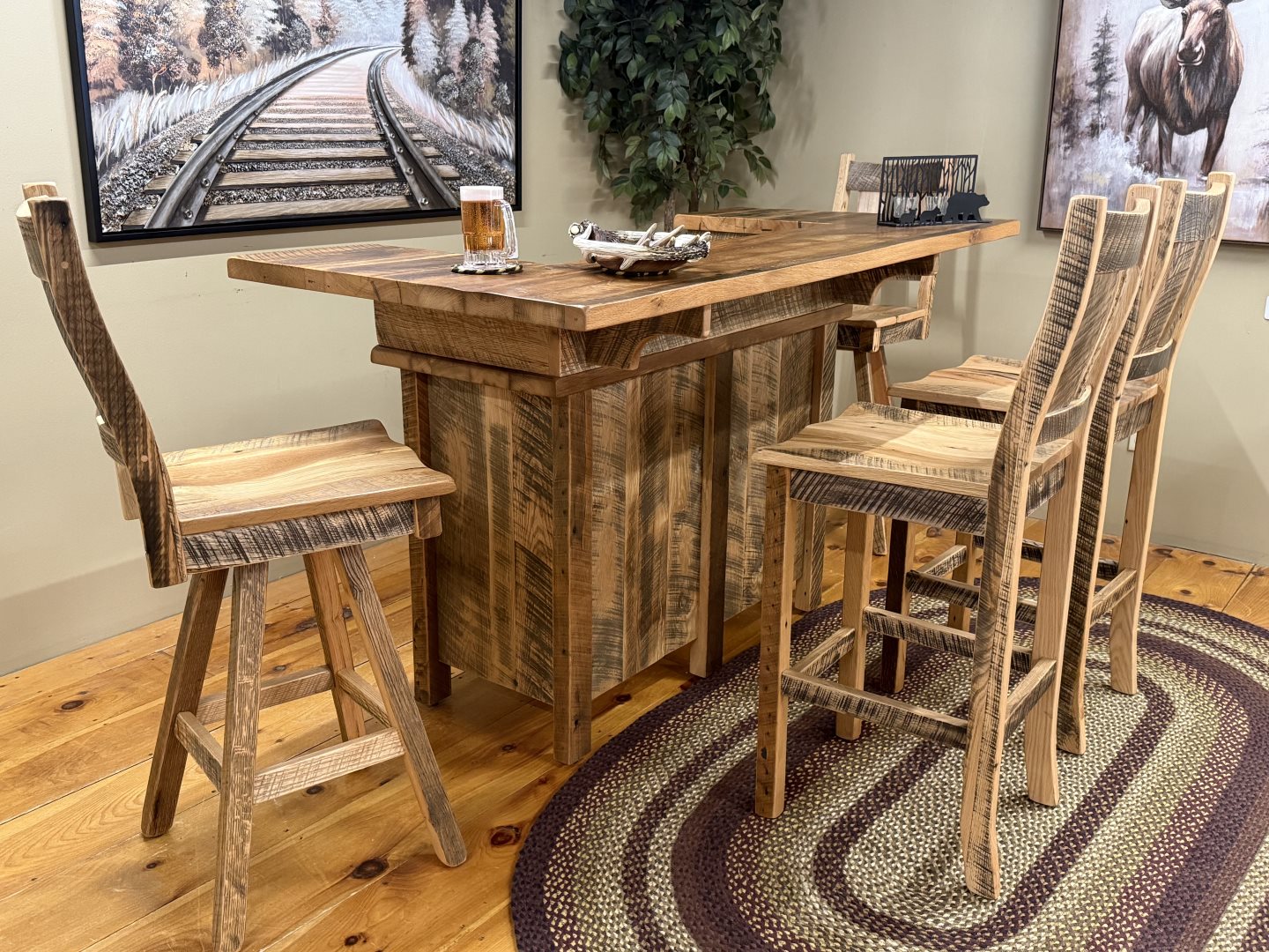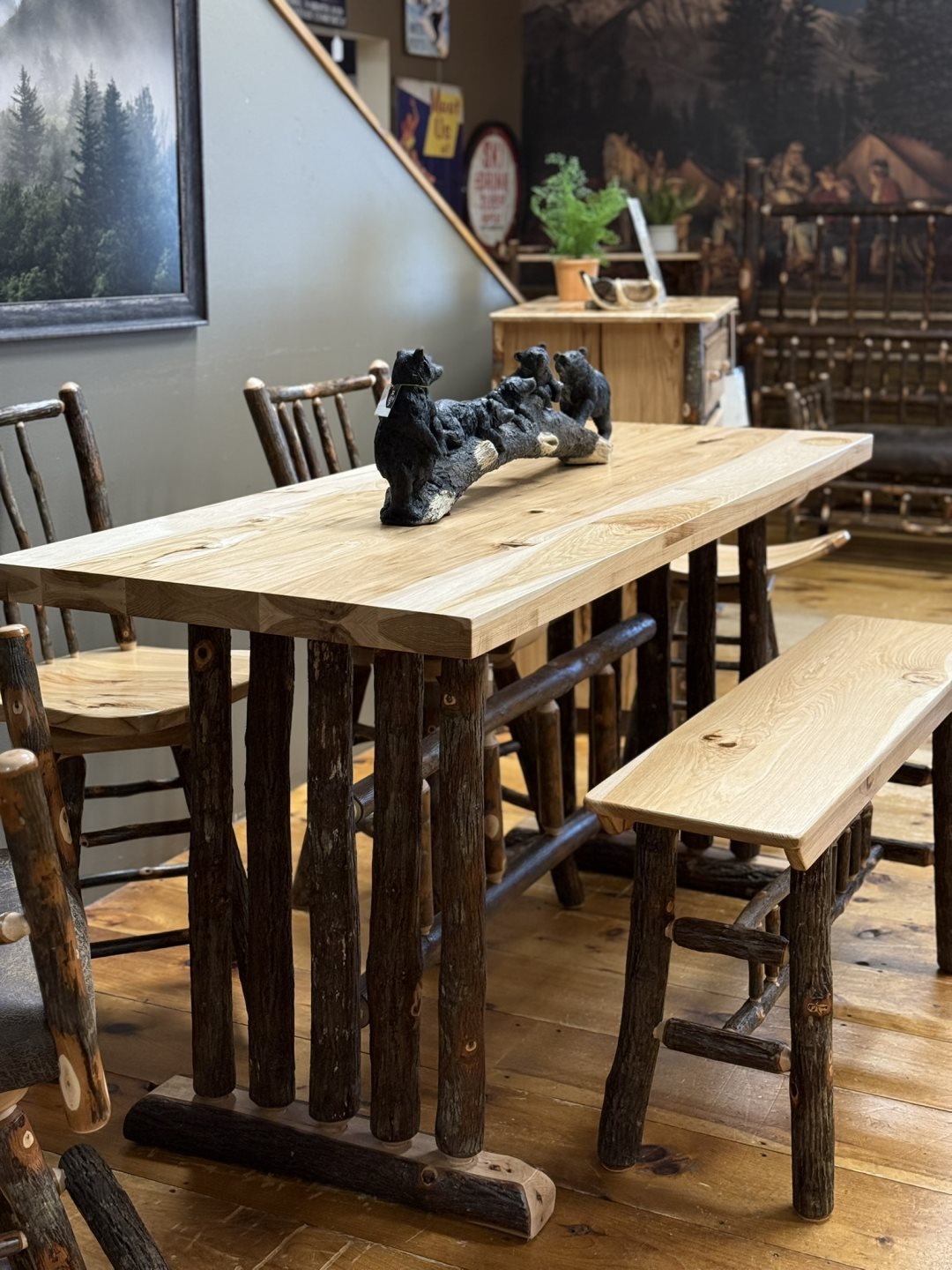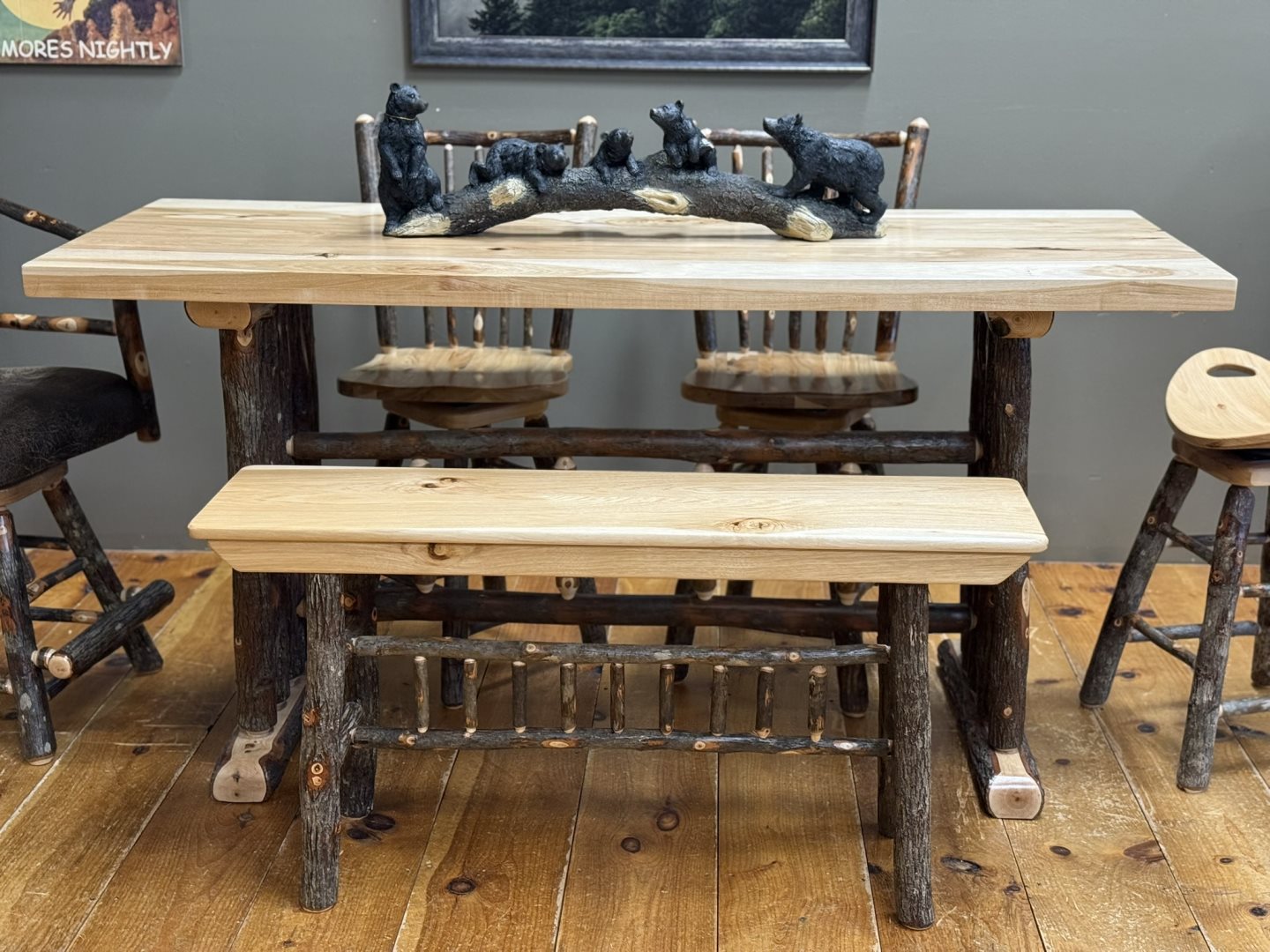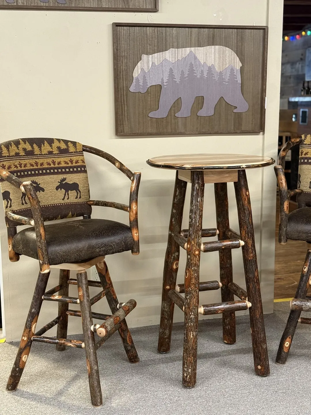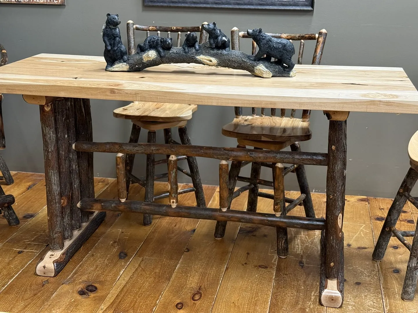 (#CT-2190) Counter Table, (#B-45-24) Bench, (#B-F1020-24/3) Swivel Stools (#B-295) & (#B-67-24) Saddle Swivel - Solid Hickory & Barked Hickory (#CT-2190) Counter Table, (#B-45-24) Bench, (#B-F1020-24/3) Swivel Stools (#B-295) & (#B-67-24) Saddle Swivel - Solid Hickory & Barked Hickory