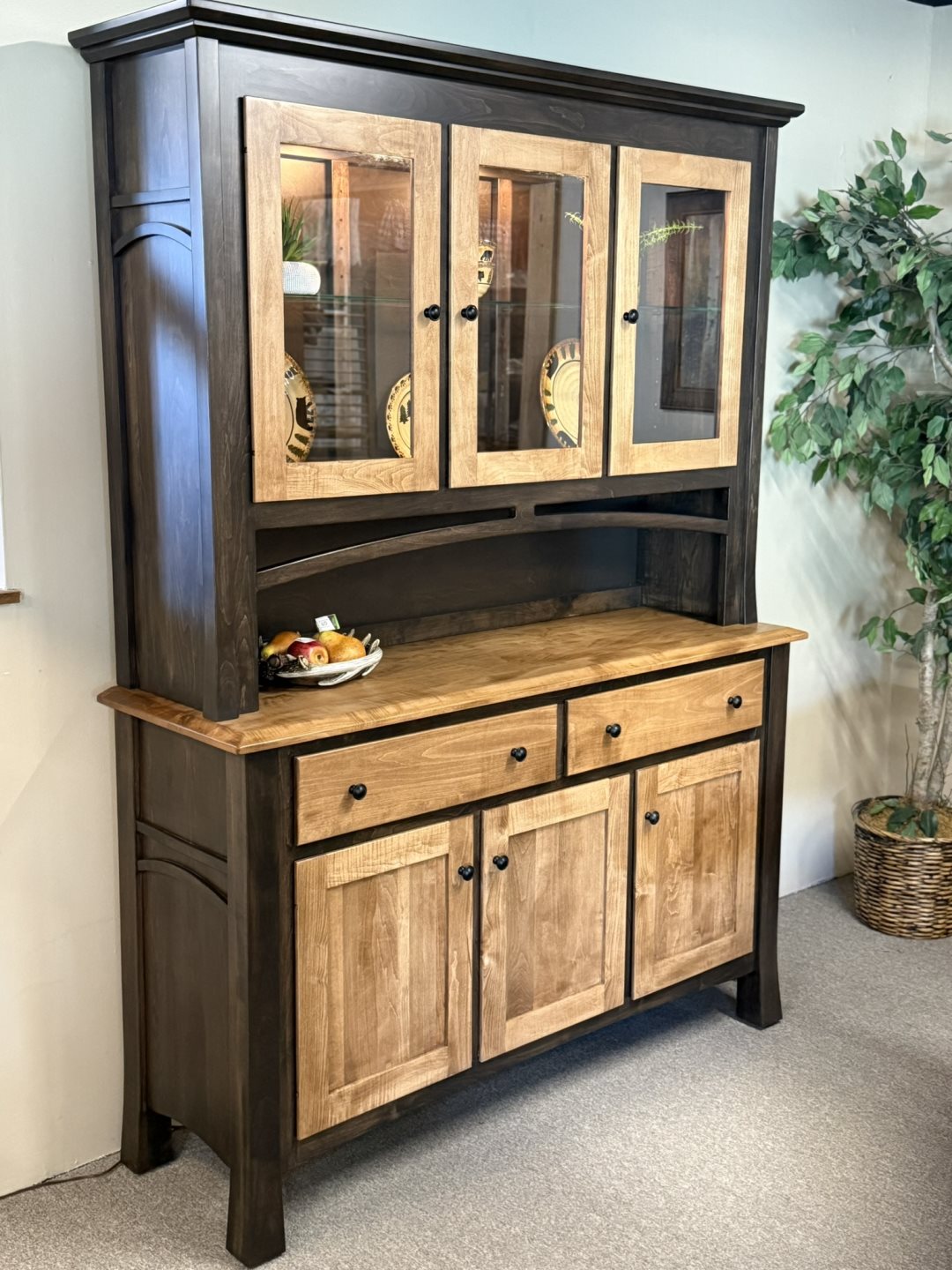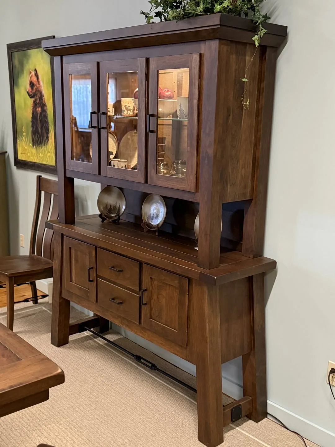Madison 3 Door Hutch (#2432), Glass Shelves, Can Lights - 59 x 18 x 80 - Solid Brown Maple. 2 Tone Stain Madison 3 Door Hutch (#2432), Glass Shelves, Can Lights - 59 x 18 x 80 - Solid Brown Maple. 2 Tone Stain