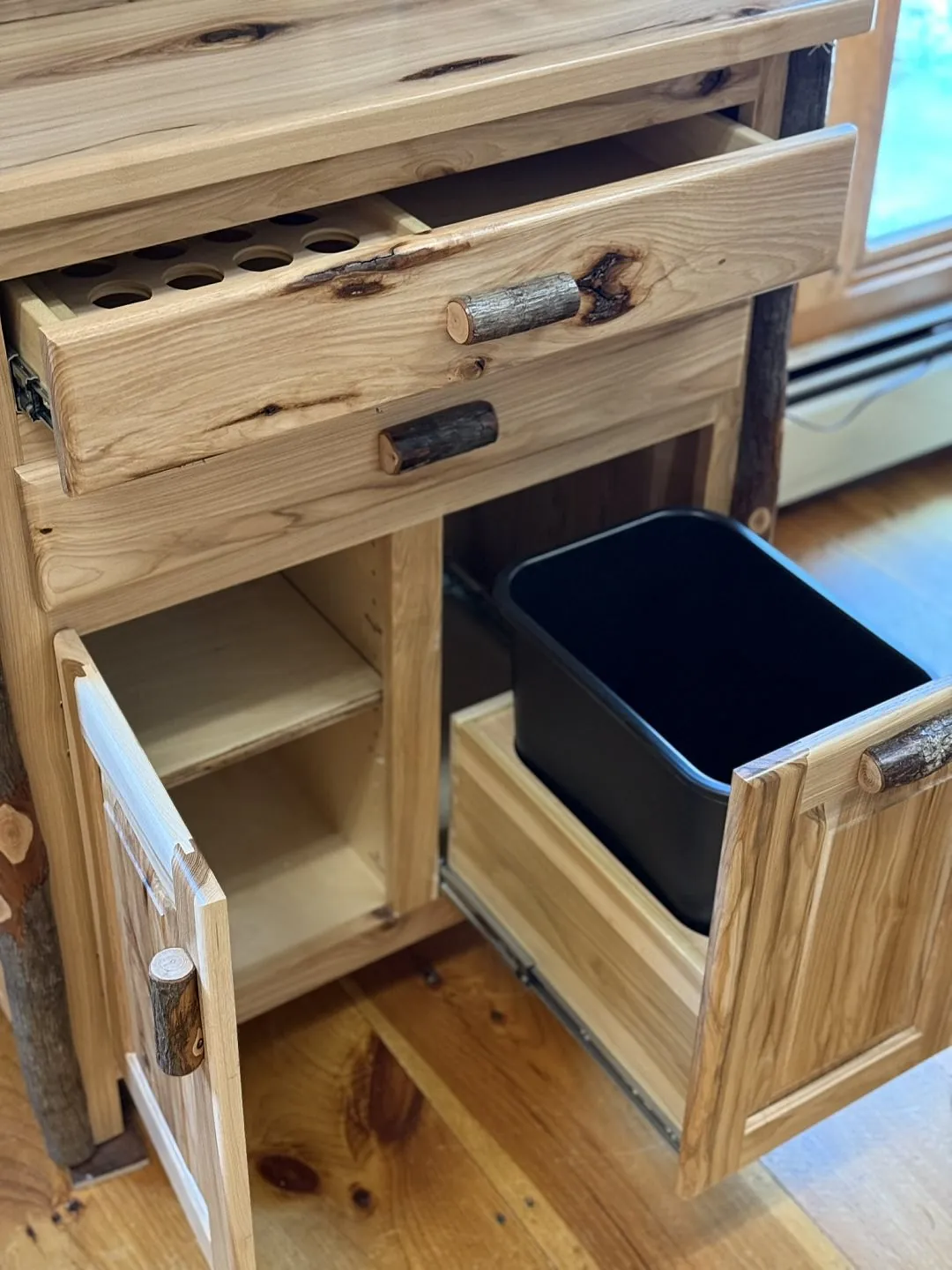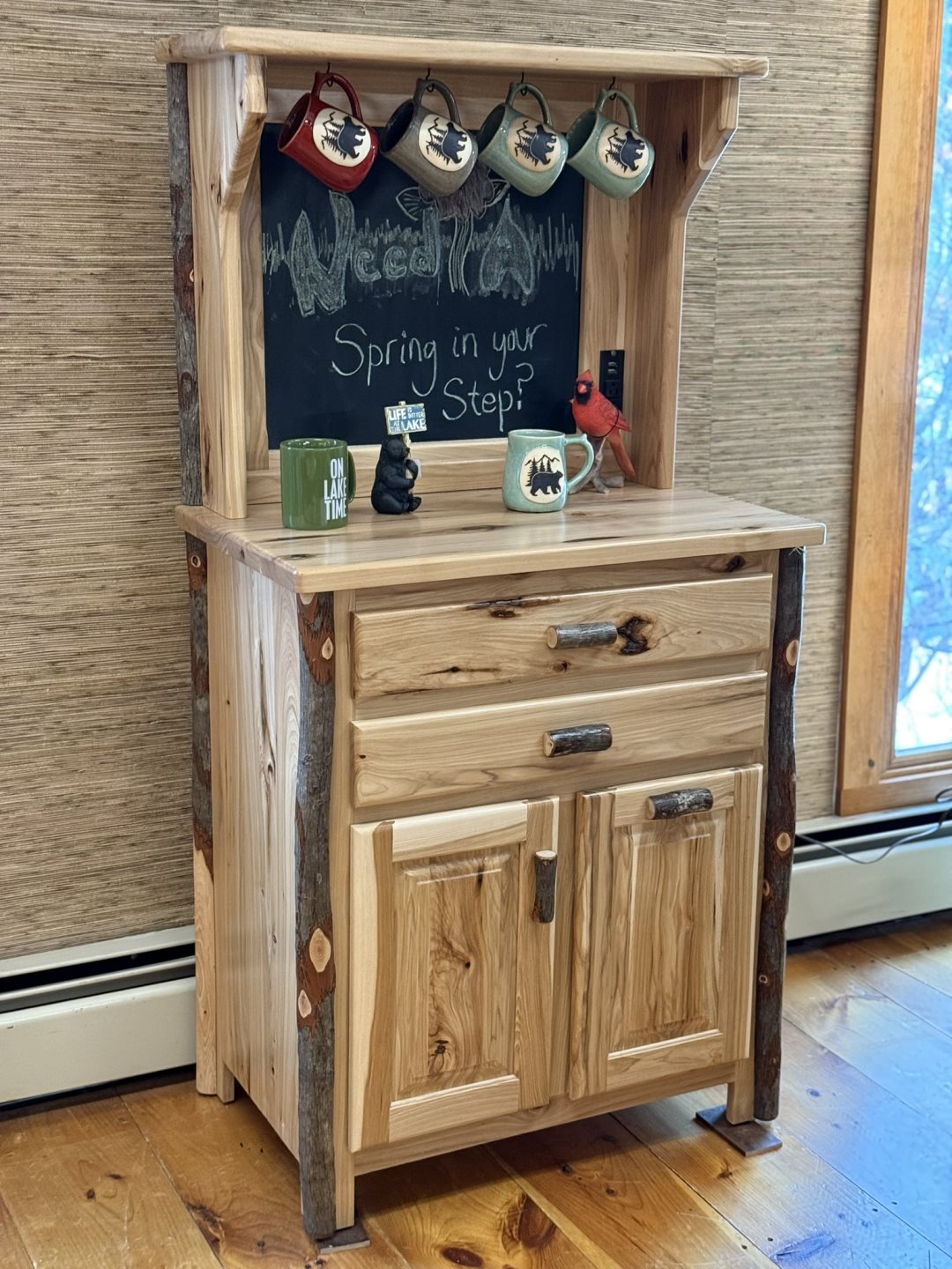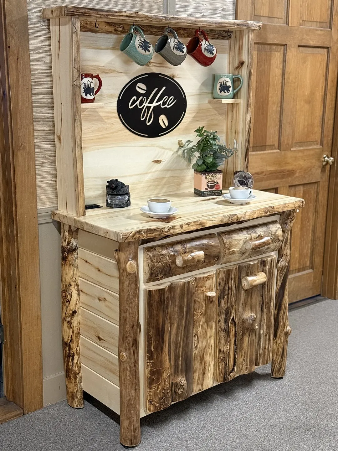 (#B-52) Coffee Bar - 34 x 20 x 66 - Solid Hickory & Barked Hickory, Chalk Board, Trash Can, K-Cup Tray, Outlets (#B-52) Coffee Bar - 34 x 20 x 66 - Solid Hickory & Barked Hickory, Chalk Board, Trash Can, K-Cup Tray, Outlets