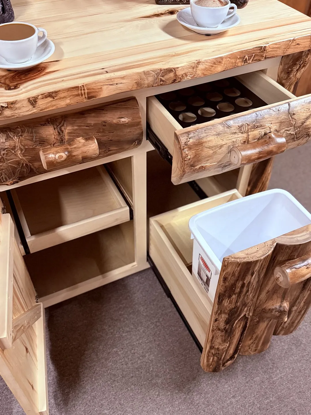 (#OF-974) Coffee Bar, Metal K Cup Tray - 42 x 21 x 67 - Solid Aspen Wood, Pullout Trash Can (#OF-974) Coffee Bar, Metal K Cup Tray - 42 x 21 x 67 - Solid Aspen Wood, Pullout Trash Can