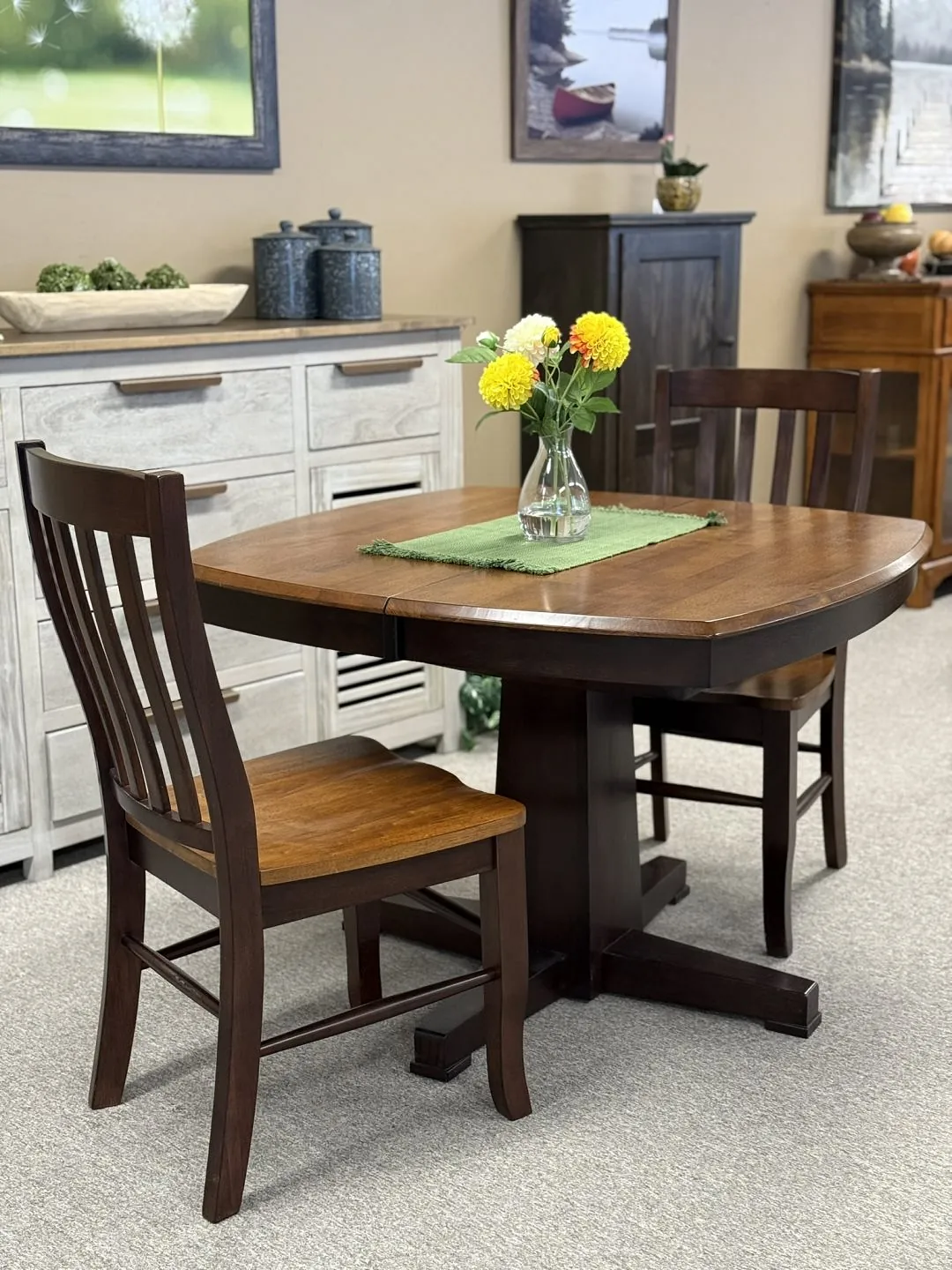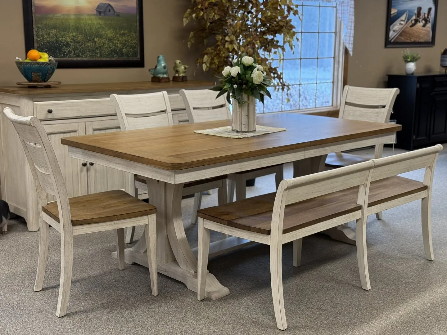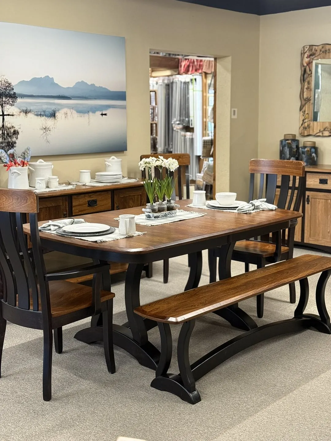 Richfield Double Pedestal Table (#RICH), Bench & Krilow (#4140) Chairs - 42 x 66, 2-12" Self Storing Leaves - Solid Elm & Brown Maple, 2 Tone Stain Richfield Double Pedestal Table (#RICH), Bench & Krilow (#4140) Chairs - 42 x 66, 2-12" Self Storing Leaves - Solid Elm & Brown Maple, 2 Tone Stain