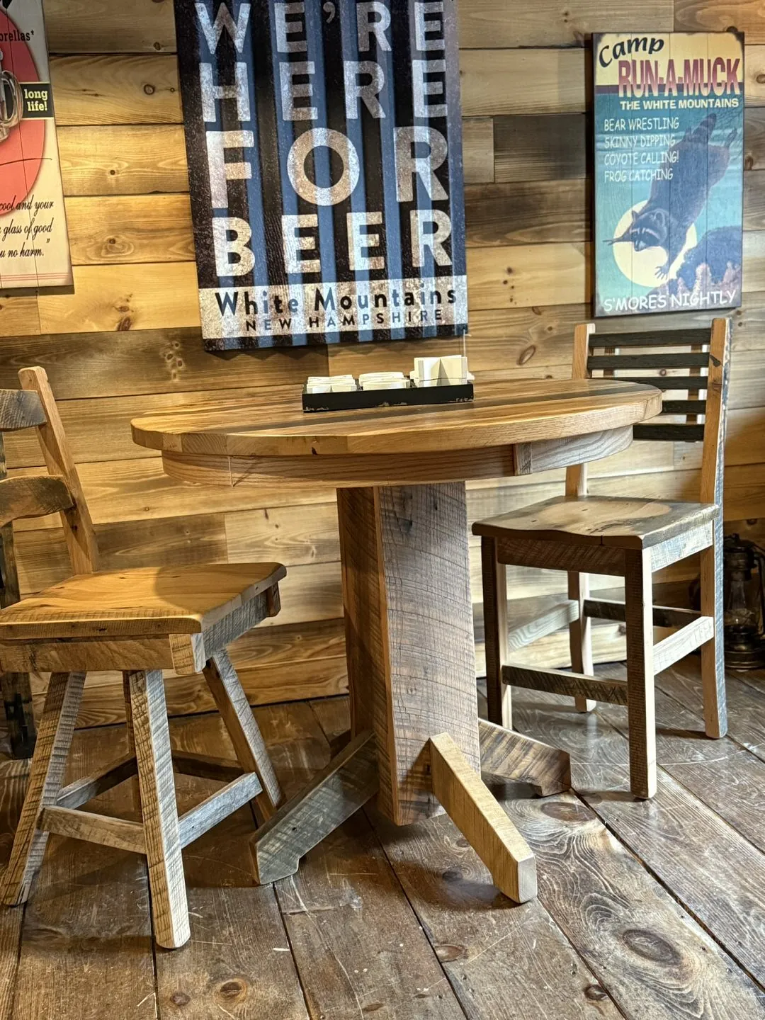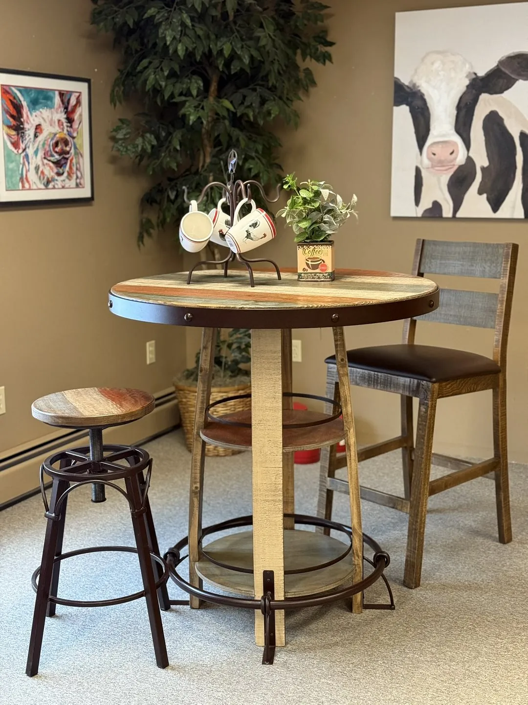 Reclaimed Oak Pedestal Pub Table (#BBP-725) & Counter Stools (#FBCS-916 & #RBB-925 ) Reclaimed Oak Pedestal Pub Table (#BBP-725) & Counter Stools (#FBCS-916 & #RBB-925 )