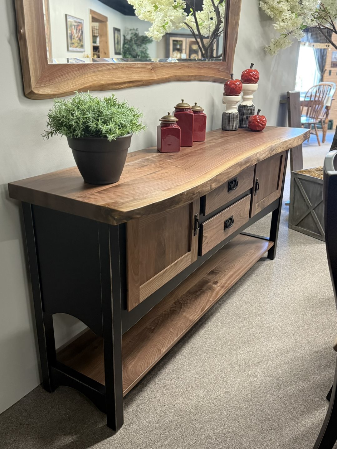 Richfield Server (#3249-72) - 72 x 18.50 x 35 - Walnut & Brown Maple, Live Edge Top, Painted Black w/Rub Thru Richfield Server (#3249-72) - 72 x 18.50 x 35 - Walnut & Brown Maple, Live Edge Top, Painted Black w/Rub Thru