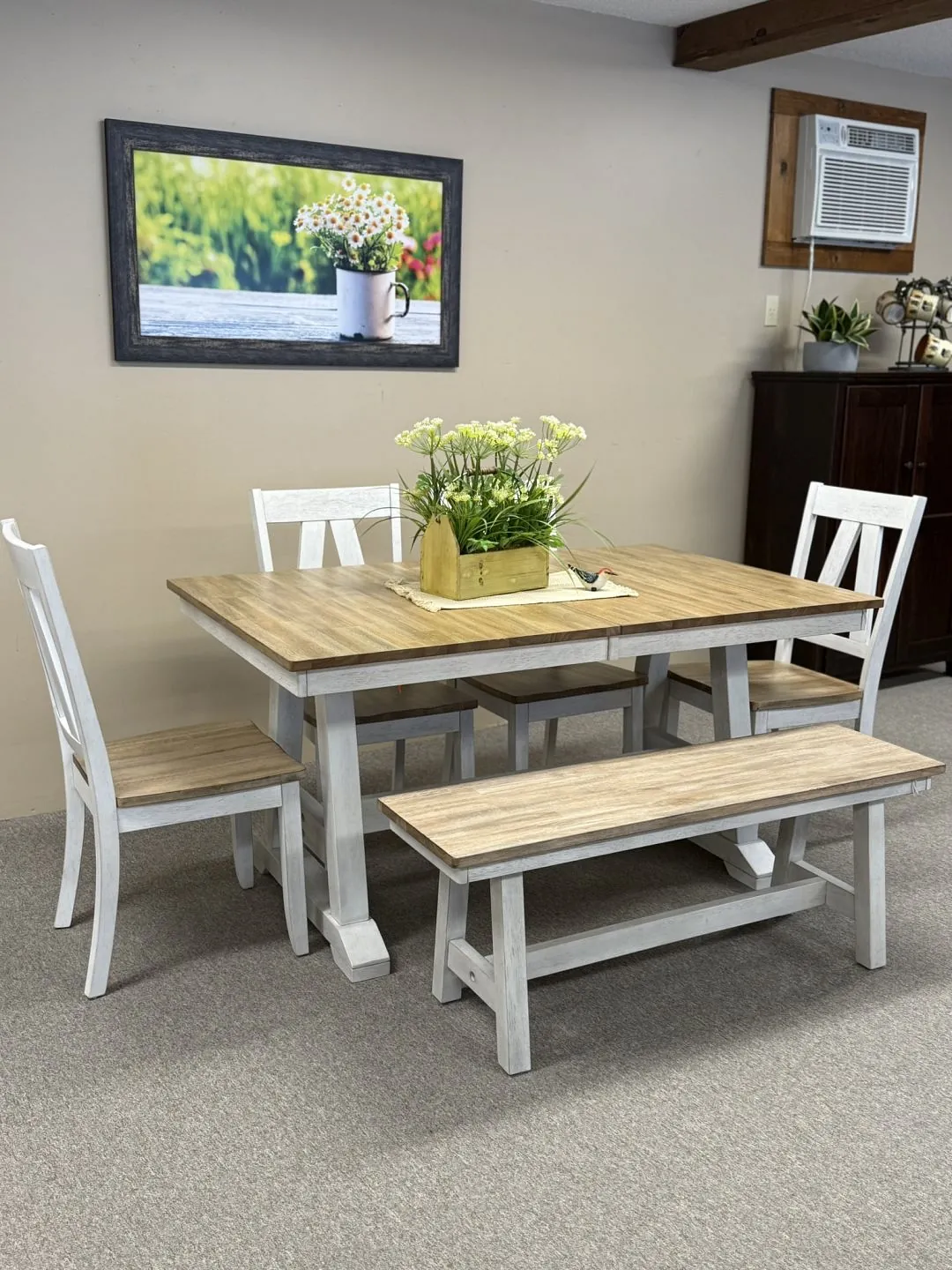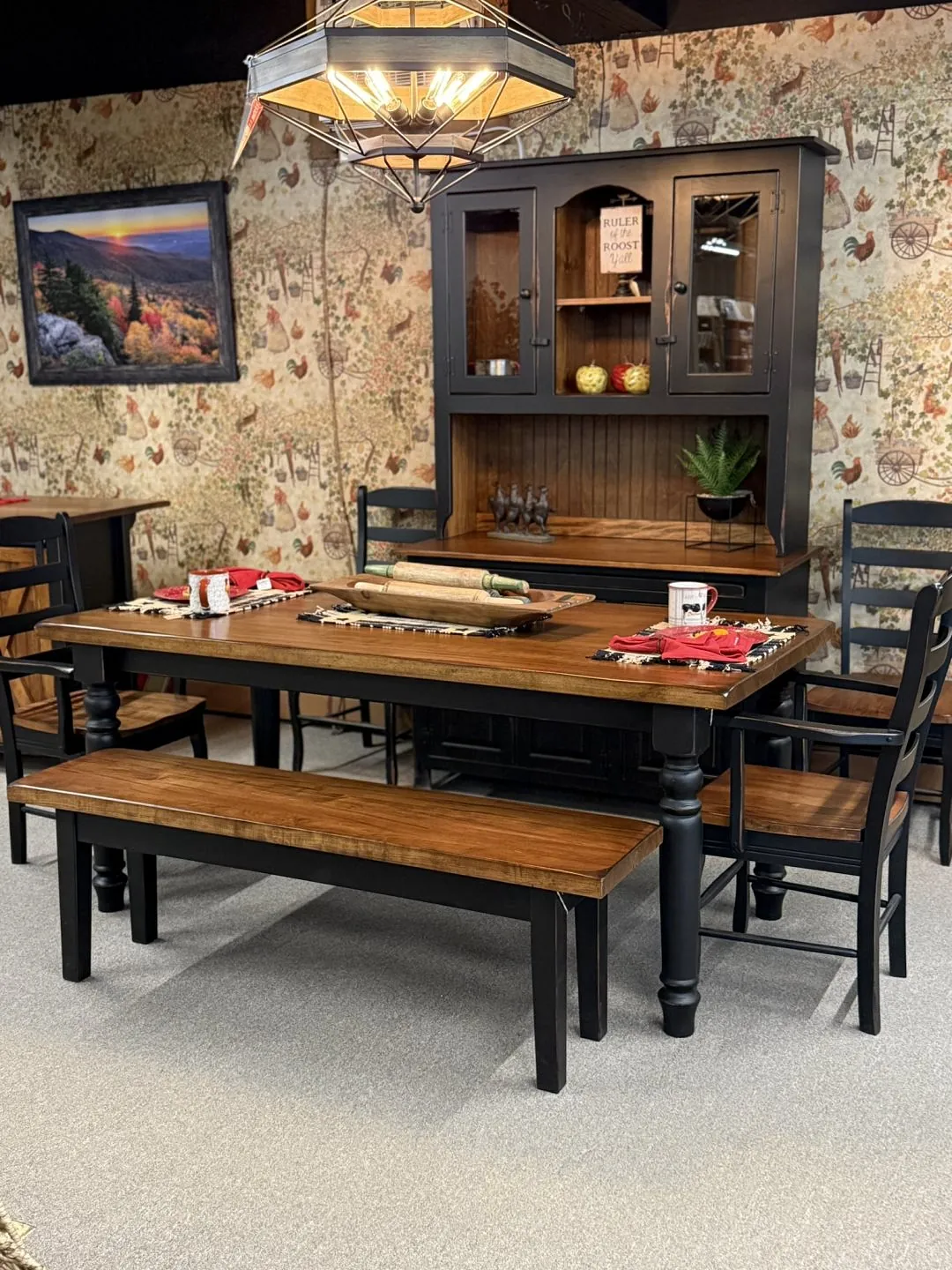 Honeybrook Woodcraft - Harvest Table (#24-I), Farm Bench & French Ladderback (#35-O) Chairs - 36 x 72 - Solid Pine Legs, 2" Thick Wormy Maple Top, 4" Turned Legs, Antiqued 2 Tone w/Varnish Honeybrook Woodcraft - Harvest Table (#24-I), Farm Bench & French Ladderback (#35-O) Chairs - 36 x 72 - Solid Pine Legs, 2" Thick Wormy Maple Top, 4" Turned Legs, Antiqued 2 Tone w/Varnish