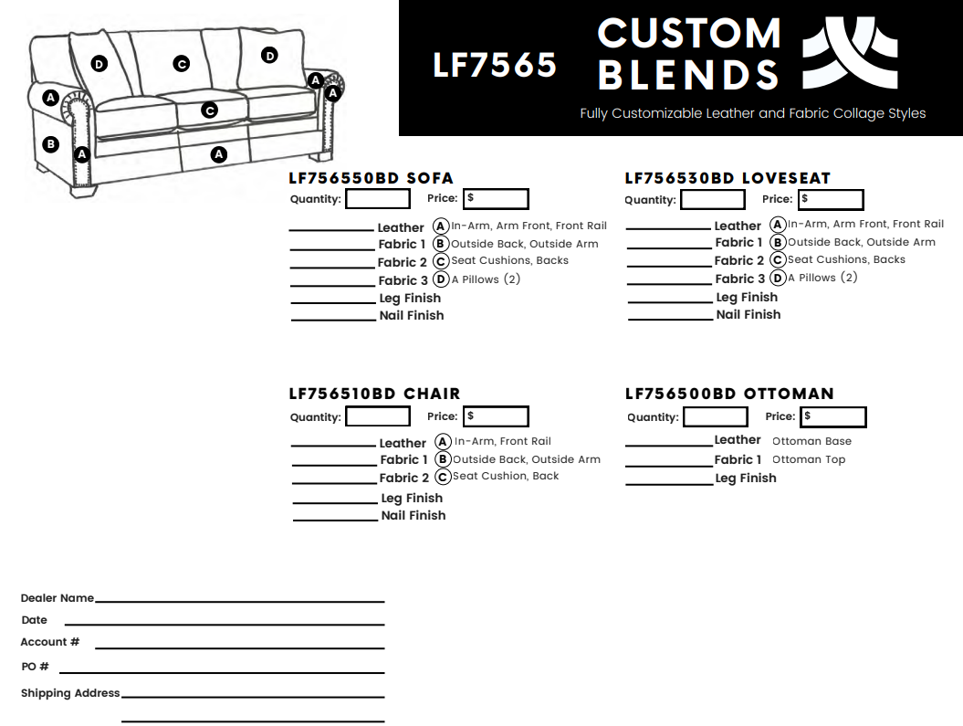 LF7565 Custom Blends Fill out FormClick the button to access the Form to fill out the options for collaging up to 3 Fabrics with Top Grain Accent Leather from the 7565 Series as an LF Custom Blend